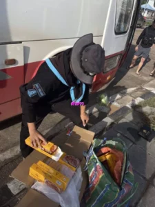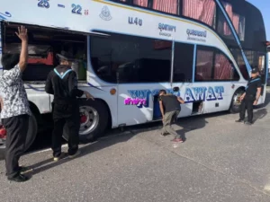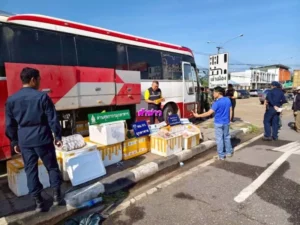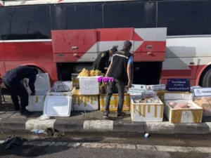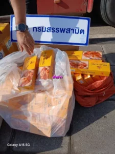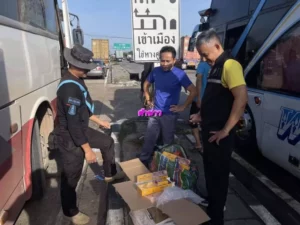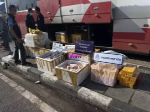 กระทั่งเจ้าหน้าที่พบบุหรี่มวน ยี่ห้อ Thang Long จำนวน 49 คัตตอน/แถว พร้อมด้วยอาหารทะเลจำพวกปลา และอาหารอื่น ๆ จำนวน 17 ลัง ประกอบด้วย สินค้าแปรรูป หมูยอ ไก่ตัว หมูยอทอด ใส้กรอก ข้าวต้มใส้หมู ขนมปังปาเต ตับบด ปอเปี๊ยะกุ้ง กรรเชียงปู ปลาช่อนอดดเดียว และปลาหวาน โดยมีผู้ต้องหาเป็นชายชาวเวียดนาม เป็นคนขับรถทัวร์ดังกล่าว
