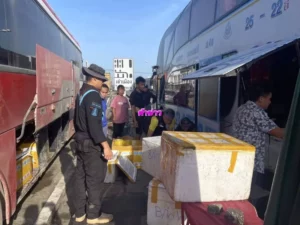 มุกดาหาร- ร้อย ฉก.ทพ.2105 บูรณาการหน่วยความมั่นคงในพื้นที่ ตรวจยึดบุหรี่ 49 แถว อาหารทะเลจำพวกปลาสด และอาหารอื่น ๆ จำนวน 17 ลัง ซุกซ่อนมากับรถทัวร์โดยสาร สปป.ลาว