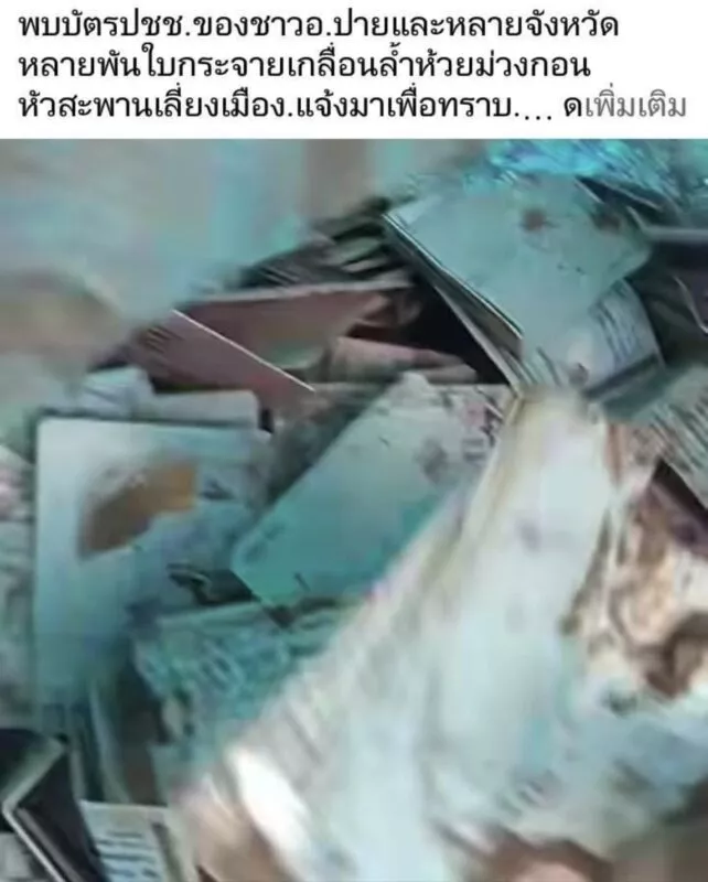เมื่อวันที่ 12 สิงหาคม 2568 ที่ผ่านมา ในสื่อโซเชียลแห่งหนึ่งในอำเภอปาย จ.แม่ฮ่องสอน ได้มีการโพสภาพบัตรประจำตัวประชาชน จำนวนมากที่ถูกทิ้งเกลื่อนในลำห้วยม่วงก๋อน หมู่ 8 ต.เวียงใต้ อ.ปาย จ.แม่ฮ่องสอน โดยผู้โพส ( สงวนนาม )ได้ระบุว่า พบบัตรประชาชนชาวอำเภอปายและหลายจังหวัดหลายพันใบ กระจายเกลื่อนลำห้วยม่วงก๋อน หัวสะพานเลี่ยงเมือง แจ้งมาเพื่อทราบ หลังจากได้มีการโพสลงสื่อโชเชียล ได้มีบางคนเข้ามาคอมเม้นท์ในทำนองว่าทำผิดกฎหมาย ล่าสุดผู้โพสได้ระบุว่า ตนเป็นคนชอบเดินเก็บขยะในที่สาธารณะและใกล้บ้านของตน และมีบางส่วนอยู่ในเขตพื้นที่บ้านของตน หากมีการตรวจสอบอาจจะทำให้ตนมีความผิดจึงได้โพสลงสื่อโซเชียลเพื่อให้มีการดำเนินการแก้ไขปัญหาต่อสิ่งที่เกิดขึ้น