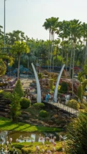 นักท่องเที่ยวจะได้เพลิดเพลินกับการแสดงสุดอลังการ “นงนุชโชว์” และการแสดงช้างแสนรู้ ที่โรงละครสกาลา วันละ 4 รอบ (เช้า 2 รอบ – บ่าย 2 รอบ) พร้อมตื่นตากับสวนสวยกว่า 60 สวน บนพื้นที่กว่า 1,700 ไร่ อาทิ สวนตะบองเพชร 1 และ 2, สวนลอยฟ้า, สวนกล้วยไม้ และเนิร์สเชอรี่ไม้ประดับหลากหลายชนิด