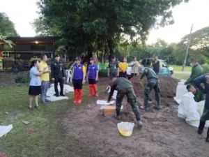 มณฑลทหารบกที่ 35 ที่ปฏิบัติหน้าที่กรอกกระสอบทรายกั้นน้ำไม่ให้เข้าท่วมในพื้นที่โรงพยาบาลตรอนและให้กำลังใจเจ้าหน้าที่ที่ปฏิบัติงานในครั้งนี้