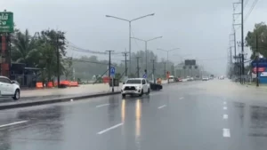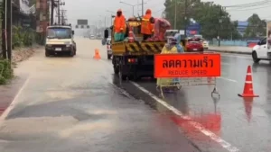 พังงา ด่วนฝนตกหนักน้ำรอระบายไหลท่วมถนนเพชรเกษมสายตะกั่วป่า-ท้ายเหมือง หมวดทางหลวงเร่งติดตั้งป้ายเตือน รถเล็กวิ่งได่ 1 ช่องทางจราจร