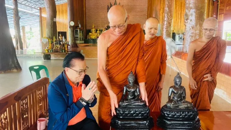 ทั้งนี้ ต่อมา พระครูวินัยธรจอมศรี ได้มอบพระพุทธรูปขนาดหน้าตัก 9 นิ้ว พระสิงห์หนึ่ง สร้างจากแร่ธรรมชาติหินเหล็กจากประเทศเมียนมา ให้ ดร.มหานิยม ไว้สักการะด้วย/////////_ดร.นิยม เวชกามา ////khao kon E san ../รายงาน