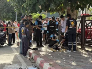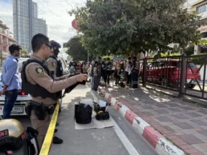 ภาพ/ข่าว ทิวากร กฤษมณี ผู้สื่อข่าวภูมิภาคประจำเมืองพัทยา จ.ชลบุรี 20 ซม. และเป็นอาวุธที่ใช้ในการก่อเหตุ จำนวน 2 เล่ม โดยอาวุธมีดเล่มแรก ตกห่างจากศพแรก ประมาณ 1 เมตร และ เล่มที่ 2 ตกอยู่บริเวณหน้าบริษัท นำเที่ยว โดยอาวุธมีดหักออกจากด้ามตกอยู่ที่กระถางต้นไม้ ตำรวจ จึงเก็บไว้เป็นหลักฐาน