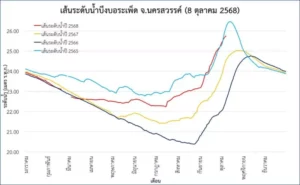 ระดับน้ำบึงบอระเพ็ดประจำวันที่ 8 ตุลาคม 2568 เวลา 07.00 น. บริเวณเขตห้ามล่าสัตว์ป่าบึงบอระเพ็ด ระดับน้ำ 25.74 ม.รทก.