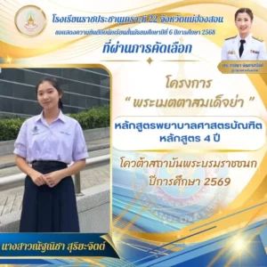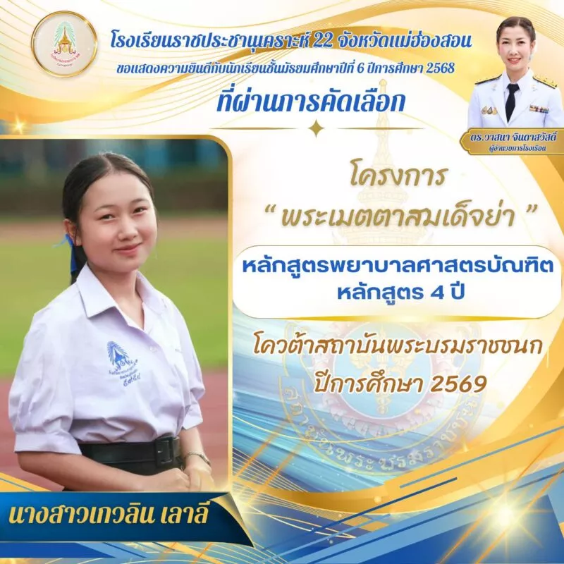 นักเรียนของ โรงเรียนราชประชานุเคราะห์ 22 จังหวัดแม่ฮ่องสอน ได้สอบผ่านการคัดเลือกนักศึกษาทุน หลักสูตรพยาบาลศาสตรบัณฑิต หลักสูตร 4 ปี “โครงการพระเมตตาสมเด็จย่า” โควต้าสถาบันพระบรมราชชนก ปีการศึกษา 2569 จำนวน 2 คนคือ 1.นางสาวเกวลิน เลาลี และ 2.นางสาวณัฐณิชา สุริยะจิตต์