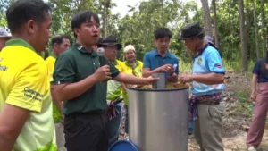 ดร.กฤษณ์ พงษ์เทพิน ผช.ผอ.ฝ่ายชุมชนสัมพันธ์ GULF กล่าวว่า การส่งเสริมนวัตกรรมถ่านไบโอชาร์แก่ชุมชน ว่า ถ่านไบโอชาร์ “ทำหนึ่งได้สาม” ถ่านไบโอชาร์ (Biochar) หรือ ถ่านชีวภาพ เป็นมากกว่าถ่านธรรมดา จากวัสดุชีวมวลจากป่าชุมชน ของเหลือใช้ทางการเกษตร เช่น กิ่งไม้ ใบไม้ ฟางข้าว หรือซังข้าวโพด ผ่านกระบวนการเผาแบบจำกัดออกซิเจน (Pyrolysis) ซึ่งเป็นกระบวนการที่สร้างคาร์บอนฯแบบเสถียรที่มีรูพรุนสูง นวัตกรรมนี้มีหลายรูปแบบ ถือเป็นว่าเป็นวิธีการที่ดีมาก สามารถสร้างประโยชน์ได้อย่างรอบด้าน ทั้งในมิติของการอนุรักษ์ป่าไม้ รักษาสิ่งแวดล้อม การฟื้นฟูดินทางการเกษตร และการลดคาร์บอน อนุรักษ์ป่า ลดมลภาวะ การผลิตและใช้ไบโอชาร์มีบทบาทสำคัญในการต่อสู้กับภาวะโลกร้อนและการอนุรักษ์ธรรมชาติอย่างแท้จริง เพราะ การกักเก็บคาร์บอนในดินระยะยาว (Carbon Sequestration) ไบโอชาร์เป็นถ่านที่มีคาร์บอนสูงและมีโครงสร้างที่เสถียรมาก เมื่อนำไปใส่ในดินจะทำหน้าที่เป็นแหล่งกักเก็บคาร์บอน ได้นานหลายร้อยถึงหลายพันปี ซึ่งช่วยลดปริมาณก๊าซคาร์บอนไดออกไซด์ CO2 ที่จะถูกปล่อยกลับสู่ชั้นบรรยากาศ ทำให้เกิดการ ลดโลกร้อน และชะลอการเปลี่ยนแปลงสภาพภูมิอากาศได้อย่างมีประสิทธิภาพ และ สอดคล้องกับกิจกรรมลดไฟป่า ของชุมชนด้วย ลดการเผาในที่โล่งและไฟป่า การนำเศษวัสดุเหลือใช้ทางการเกษตรและเศษกิ่งไม้ ใบไม้ในพื้นที่ป่าหรือไร่นา มาผลิตเป็นไบโอชาร์ เป็นการจัดการของเสียอินทรีย์วัตถุที่สร้างสรรค์ ช่วย ลดปริมาณเชื้อเพลิง ในธรรมชาติที่เสี่ยงต่อการเกิด ไฟป่า และยังช่วย ลดมลพิษฝุ่นควัน PM 2.5 ที่เกิดจากการเผาในที่โล่ง ซึ่งส่งผลดีต่อสุขภาพและสิ่งแวดล้อมโดยรวม ช่วยปรับปรุงคุณภาพดินให้พืชเติบโตได้ดีขึ้น ไบโอชาร์สามารถนำไปแช่จุลินทรีย์ เป็น “ถ่านจุลินทรีย์” สารปรับปรุงดินเป็นหัวใจสำคัญของการเกษตรที่ยั่งยืน เพิ่มการอุ้มน้ำ ไบโอชาร์มีรูพรุนสูงมาก (High Porosity) ทำหน้าที่เหมือนฟองน้ำ ช่วยให้ดินสามารถ เก็บน้ำและความชื้น ได้ยาวนานขึ้น ทำให้พืชทนทานต่อภาวะแล้ง เป็นบ้านของจุลินทรีย์ โครงสร้างรูพรุนเหล่านี้เป็นที่อยู่อาศัยที่สมบูรณ์แบบสำหรับ จุลินทรีย์ที่มีประโยชน์ ในดิน ซึ่งช่วยเพิ่มกิจกรรมทางชีวภาพของดิน กักเก็บและปลดปล่อยสารอาหารช่วย กักเก็บสารอาหาร และลดการชะล้างของปุ๋ย (ลดการสูญเสียไนโตรเจนและฟอสฟอรัส) พร้อมทั้งช่วย ลดความเป็นกรดของดิน ทำให้พืชสามารถดูดซึมสารอาหารได้ดีขึ้น ลดการใช้ปุ๋ยเคมีและเพิ่มผลผลิต การผลิตถ่านไบโอชาร์เป็นเชื้อเพลิง ปรับปรุงดิน จะสร้างอาชีพ สร้างรา