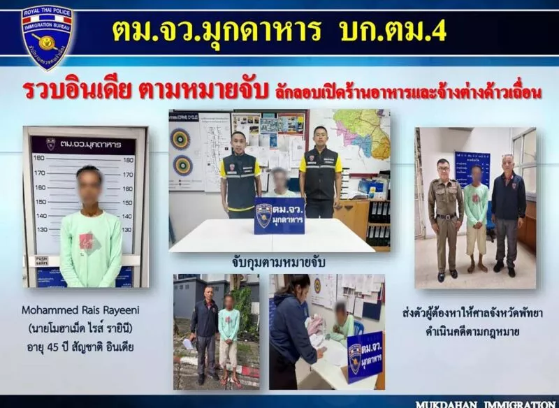 โดยเจ้าหน้าที่ชุดสืบสวนฯ ร่วมกับ งานตรวจบุคคลและพาหนะ ตม.จว.มุกดาหาร ได้ทำการจับกุมหนุ่มชาวอินเดีย กล่าวคือ เมื่อวันที่ 17 ตุลาคม 2568 เวลาประมาณ 10.00 น. นายโมฮาเม็ด ไรส์ รายินี (Mr.Mohammed Rais Rayeeni) ได้มายื่นหนังสือเดินทางให้เจ้าหน้าที่ตรวจเพื่อประสงค์จะเดินทางออกนอกราชอาณาจักร ณ จุดผ่านแดนถาวรสะพานมิตรภาพไทย-ลาว แห่งที่ 2 (มุกดาหาร-สะหวันนะเขต) เมื่อเจ้าหน้าที่งานตรวจบุคคลและพาหนะ ตม.จว.มุกดาหาร ได้ทำการตรวจสอบข้อมูลในระบบสารสนเทศตรวจคนเข้าเมือง (BIOMETRIC) พบว่าเป็นบุคคลต้องห้ามเดินทางเข้าออกราชอาณาจักร จึงได้แจ้งประสานชุดสืบสวนฯ ตม.จว.มุกดาหาร มาตรวจสอบเพื่อดำเนินการเช็คข้อมูลในระบบ CRIMES ผลปรากฏว่า นายโมฮาเม็ด ไรส์ รายินี (Mr.Mohammed Rais Rayeeni) อายุ 45 ปี สัญชาติ อินเดีย ถือหนังสือเดินทางเลขที่ Z8150800 แจ้งที่อยู่ 27/19 หมู่ที่ 10 ต.หนองปรือ อ.บางละมุง จ.ชลบุรี มีหมายจับศาลจังหวัดพัทยา ที่ 712/2568 ลง 16 ตุลาคม 2568 กระทำความผิดฐาน “ร่วมกันรับคนต่างด้าวทำงานโดยที่คนต่างด้าวไม่มีใบอนุญาตทำงานหรือ ให้คนต่างด้าวทำงานนอกเหนือจากสิทธิที่จะทำได้ และร่วมกันขายสุราโดยไม่ได้รับอนุญาต”