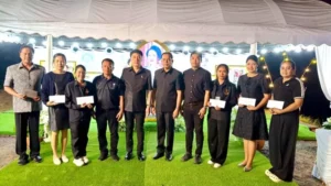 จากนั้น นายอิศรา กาญจนรัตน์ นายกเทศมนตรีตำบลบ้านกรูด พร้อม นายสมหมาย ปานทอง อุปนายกสมาคมกำนันผู้ใหญ่บ้านแห่งประเทศไทย พร้อม ผู้นำชุมชน ได้ร่วมมอบทุนการศึกษาให้แก่โรงเรียนในเขตตำบลธงชัย จำนวน 7 โรงเรียน จากรายได้หลังจากการจัดกิจกรรม “บ้านกรูดรันเดอร์แลนด์” BANKRUT RUNDERLAND 2025 ครั้ง เมื่อเดือนกรกฎาคมที่ผ่านมา ได้แก่ โรงเรียนธงชัยวิทยา โรงเรียนวัดดอนยาง โรงเรียนวัดธงชัยธรรมจักร โรงเรียนวัดถ้ำคีรีวงศ์ โรงเรียนบ้านหนองระแวง โรงเรียนบ้านหนองมงคล และโรงเรียนบ้านดอนสำราญ