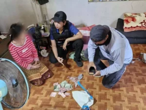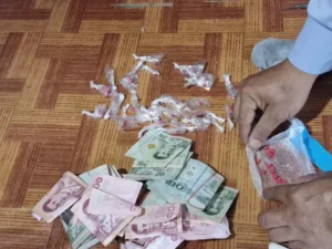 เจ้าหน้าที่ได้ลงพื้นที่บ้านเป้าหมาย พบ นางสมเพียร (ขอสงวนนามสกุล) อายุ 54 ปี อยู่ภายในบ้านหลังที่ได้รับแจ้ง เจ้าหน้าที่จึงแสดงความบริสุทธิ์ใจก่อนทำการตรวจค้นอย่างเป็นไปตามขั้นตอน ผลการตรวจค้นพบยาบ้าบรรจุซองพลาสติกหลายถุง ซุกซ่อนในถุงเท้าที่ถูกยัดไว้ในกระสอบเสื้อผ้าเก่าข้างตู้เสื้อผ้าภายในบ้าน อีกทั้งยังพบเงินสดที่คาดว่าเกี่ยวข้องกับการจำหน่ายยาเสพติดอยู่ในกระเป๋าสะพายข้างสีขาวของนางสมเพียรฯ