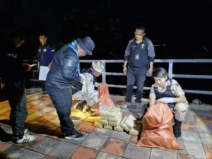 กระทั่งเวลา 17.30 น. ( 24 พ.ย.) เจ้าหน้าที่ได้ซุ่มเฝ้าดูบริเวณที่ได้รับแจ้งดังกล่าว ได้มีเรือกีบเพลายาวแล่นมาจากประเทศเพื่อนบ้าน เข้ามาจอดที่บริเวณริมฝั่งแม่น้ำโขงบ้านนาเวียงแก ต.นาสีนวน อ.เมือง จ.มุกดาหาร ต่อมาคนขับเรือได้โยนกระสอบสีขาวขึ้นมาบนฝั่ง เจ้าหน้าที่ชุดซุ่มได้เข้าไปเพื่อแสดงตัวและตรวจสอบ คนขับเรือเห็นเจ้าหน้าที่ได้หันหัวเรือแล้วแล่นไปประเทศเพื่อนบ้าน