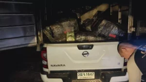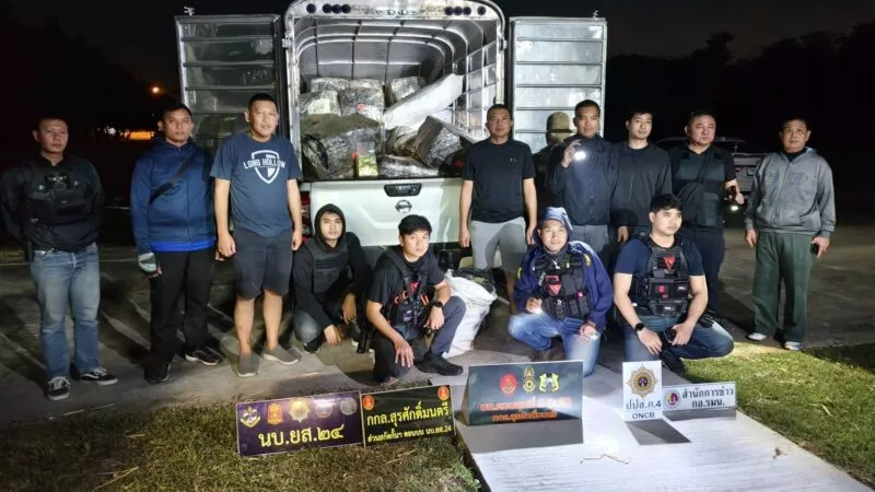 เมื่อ 5 ธ.ค. 68 เวลา 13.30 น.ที่ฐานปฏิบัติการ หน่วยเฝ้าตรวจชายแดนที่ 21 บก.ควบคุมที่ 2 กองกำลังสุรศักดิ์มนตรี โรงเรียนบ้านดงเวร ต.หินโงม อ.เมืองหนองคาย จ.หนองคาย นายศรัณศักด์ ศรีเครือเนตร ผู้ว่าราชการจังหวัดหนองคาย , นายไพฑูรย์ มหาชื่นใจ รองผู้ว่าราชการจังหวัดหนองคาย , พ.อ.เรวัฒ ธรรมจิรเดช เสธ.กองกำลังสุรศักดิ์มนตรี , พล.ต.ต.อัทธชนม์ ช่วงงาม ผบก.จ.หนองคาย , พ.อ.วีรเทพ การุณรอบดุล รอง ผอ.รมน.จังหวัด น.ค.(ท.) , นายประทีป อุ่ยเจริญ ปลัดจังหวัดหนองคาย พร้อมหน่วยงานที่เกี่ยวข้อง ได้ร่วมกันแถลงข่าวการจับกุมครั้งนี้ สืบเนื่องจากเมื่อวันที่ 1 ธันวาคม 2568 หน่วยเฝ้าตรวจชายแดนที่ 21 ได้รับรายงานด้านการข่าวจาก ชุดปฏิบัติการข่าวที่ 3 กองกำลังสุรศักดิ์มนตรี ได้ทราบว่ามีความเคลื่อนไหวจากกลุ่มนัก ค้ายาเสพติด ในพื้นที่ บ้านควายแดง เมืองหาดทรายฟอง เขตนครหลวงเวียงจันทน์ ฝั่งตรงข้าม บ้านบอน หมู่ 4 ตำบลหาดคำ อำเภอเมืองหนองคาย จังหวัดหนองคาย ว่าจะมีการขนย้ายยาเสพติดข้ามมายังฝั่งไทย ในห้วงวันที่ 2-5 ธันวาคม 2568