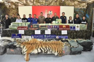 เมื่อวันที่ 5 ธ.ค. 68 เวลา 03.20 น. กองทัพบก โดย พล.ท.วีระยุทธ รักษ์ศิลป์ มทภ.2/ผบ.นบ.ยส.24 อำนวยการให้ กกล.สุรศักดิ์มนตรี/สกัดกั้น ฯ ตอนบน/ บก.ควบคุมที่ 2 (ร.13) หน่วยเฝ้าตรวจชายแดนที่ 21 จัดกำลังพล ร่วมกับ เจ้าหน้าที่ตำรวจ กองกองกำกับการ สืบสวน ตำรวจภูธรจังหวัดหนองคาย เฝ้าตรวจ/สกัดกั้น บริเวณช่องทาง บ้านบอน หมู่ 4 ตำบลหาดคำ อำเภอเมืองหนองคาย จังหวัดหนองคาย ซึ่งคาดว่าจะใช้ลำเลียงยาเสพติด ผ่านเข้ามาในพื้นที่ จนกระทั่งวันที่ 5 ธันวาคม 2568 เวลา 02.30 น. พบความเคลื่อนไหวบริเวณช่องทางโรงสูบน้ำ บ้านบอนฯ ตรวจพบรถยนต์ตู้ทึบ วิ่งออกจากช่องทาง ไปตามถนนหลวง หมายเลข 212 มุ่งหน้าไปยังทางทิศตะวันออก จึงแจ้งให้ชุดสกัดกั้น (หน่วยเฝ้าตรวจชายแดนที่ 21 ร่วมกับ กองกำกับการสืบสวน ตำรวจภูธรจังหวัดหนองคาย) ทำการสกัดกั้นตรวจสอบรถคันดังกล่าว และเมื่อเวลา 03.20 ณ ชุดสกัดกั้น ตรวจพบรถยนต์ต้องสงสัย บริเวณปากทางเข้าบ้านดงเวร ตำบลสีกาย อำเภอเมืองหนองคาย จังหวัดหนองคาย จึงได้ทำการขอตรวจค้นภายในรถ พบกระสอบ ข้างในบรรจุยาเสพติดประเภท 1 (ไอซ์) รวมทั้งสิ้นจำนวน 889 กก. (กระสอบสีดำ 20 กระสอบ กระสอบสีขาว 2 กระสอบ) เคตามีน 200 กก. บรรจุในกระสอบสีขาว จำนวน 5 กระสอบ ซากหนังเสือจำนวน 1 ผืน และรถยนต์ จำนวน 1 คัน และผู้ต้องหาที่เป็นคนขับรถ 1 ราย ทราบชื่อต่อมาคือนายคมสัน อายุ 28 ปี ภูมิลำเนาจังหวัดหนองคาย ตรวจยึดยาเสพติดทั้งหมดและควบคุมตัวผู้ต้องหามา ที่ฐานปฏิบัติการ หน่วยเฝ้าตรวจชายแดนที่ 21 บก.ควบคุมที่ 2 เพื่อสอบปากคำเบื้องต้นและทำบันทึกการจับกุม
