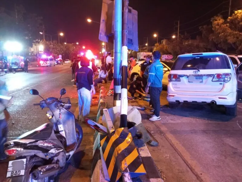 *ลำปาง*อุบัติเหตุใหญ่ รถยนต์เก๋งหลักเลี้ยวตัดหน้ารถวิ่งทางตรงชนกันกลางแยก รถทางตรงเสียหลักพุ่งชนรถที่จอดติดไฟแดงหลายคันบาดเจ็บระนาว