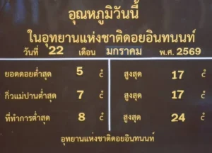 เมื่อเวลา 08.20 น วันที่ 22 ม.ค 69 ทางอุทยานแห่งชาติดอยอินทนนท์ อ จอมทองเชียงใหม่ โดยนายจีรนิติ เชิงสะอาด หัวหน้าอุทยานแห่งชาติดอยอินทนนท์ ได้รายงานว่า อุณหภูมิที่บนดอยอินทนนท์ เพิ่มขึ้นเล็กน้อย แต่ยังคงหนาวอยู่ อุณหภูมิที่ยอดดอยวัดได้ 5 องศา ที่กิ่วแม่ปานวัดได้ 7 องศา ที่ทำการอุทยานฯ วัดได้ 8 องศา ยังคงหนาวอยู่ นักท่องเที่ยวยังคงมาสัมผัสอากาศหนาวบนดอยอินทนนท์ ต่อเนื่อง และยังพบเหมยขาบบางจุดเล็กน้อย และน้ำค้างแข็งเกาะที่ยอดหญ้าและดอกหญ้า บริเวณ กม 45 และข้างทางบางจุด นักท่องเที่ยวได้ชมแสงอาทิตย์ยามเช้า ทะเลหมอก และเดินชมศึกษาธรรมชาติในเขตอุทยานแห่่งชาาติดอยอินทนนท์ นักท่อ่งเที่ยวยังถ่ายภาพคู่กับรถสี่ล้อเหลือง รถประจำทางขึ้นดอยของ อ จอมทอง กันเป็นที่ระลึก อย่างมีความสุข ที่ได้ขึ้นมาบนดอยอินทนนนท์