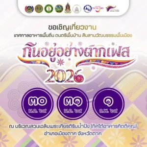 เรียนเชิญสื่อมวลชนและผู้สนใจทุกท่าน ร่วมพิธีเปิดกิจกรรม “กินอยู่อย่างตากเฟส 2026” เทศกาลอาหารพื้นถิ่น ดนตรีพื้นบ้าน สืบสานวัฒนธรรมพื้นเมืองประจำปี 2569 ในวันศุกร์ที่ 30 มกราคม 2569 ตั้งแต่เวลา 18.30 น. เป็นต้นไป ณ สวนเฉลิมพระเกียรติริมน้ำปิง (ด้านทิศใต้อาคารกิตติคุณ) อำเภอเมืองตาก จังหวัดตาก (รายละเอียดตามกำหนดการ)