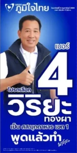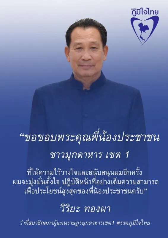 เขตเลือกตั้งที่ 1 นายวิริยะ ทองผา พรรคภูมิใจไทย ได้คะแนน 29,345 คะแนน ตามด้วย นายนนทภูมิ ตั้งปณิธานนท์ พรรคเพื่อไทย 21,666 นายชายสิทธิ์ สุวรรณโชติ 17,650 เลือกตั้งสนามมุกดาหารแห่งนี้ รอบนี้อาจถึงปิดฉากเพื่อไทย ณ เมืองมุกดาหารก็เป็นได้ ครั้งนี้ มุกดาหารได้ สส. จากพรรคภูมิใจไทยของคน “อิสาน” จึงเชื่อว่าบ้านเมืองในพื้นที่อิสานจะเห็นการเปลี่ยนแปลงมากขึ้นกว่าเดิม อย่างน้อยสารตั้งต้นของเส้นทางคมนาคม “ท่องเที่ยวเลาะเขื่อนริมโขง” จาก อ.เมืองมุกดาหาร สู่ อ.หว้านใหญ่ระยะทางประมาณ 25 กม. เชื่อมเมืองท่องเที่ยว อ.ธาตุพนม จ.นครพนม จึงเป็นที่คาดหมายของประชาชน