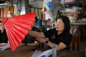 ในการลงพื้นที่จังหวัดเชียงใหม่ครั้งนี้ อธิบดีกรมทรัพย์สินทางปัญญา และคณะได้ไปตรวจเยี่ยมกระบวนการผลิตสินค้า GI “ร่มบ่อสร้าง” ณ วิสาหกิจชุมชนกลุ่มร่มหลวงลุงวงค์ ตําบลต้นเปา อําเภอสันกําแพง ซึ่งเป็นแหล่งผลิตร่มทำมือที่ยังคงกระบวนการผลิตแบบดั้งเดิมที่เป็นมิตรต่อสิ่งแวดล้อม ตั้งแต่การขึ้นโครง