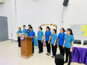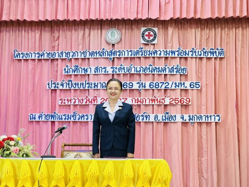 นาง นีรนาธ มณีฤทธิ์ รองนายกเหล่ากาชาดจังหวัดมุกดาหาร เป็นประธานในพิธีพร้อมคณะ โดยมีนาย สุรินทร คูณเมือง ผู้อำนวยการศูนย์การเรียนรู้ ระดับอำเภอ นิคมคำสร้อยพร้อมคณะกล่าวรายงาน โครงการ ค่ายอาสายุวกาชาด หลักสูตรการเตรียมความพร้อมรับภัยพิบัติของนักศึกษา สกร.อำเภอนิคมคำสร้อย ประจำปีงบประมาณ2569 รุ่นที่6872/มห.65 มีนักศึกษาเข้าร่วมโครงการ 60คน หลักสูตร 2วัน 1คืนแบบพักค้างคืน ระหว่างวันที่ 26-27/ กพ.69 ณ ธารจินดารีสอร์ท อ.เมือง จ.มุกดาหาร